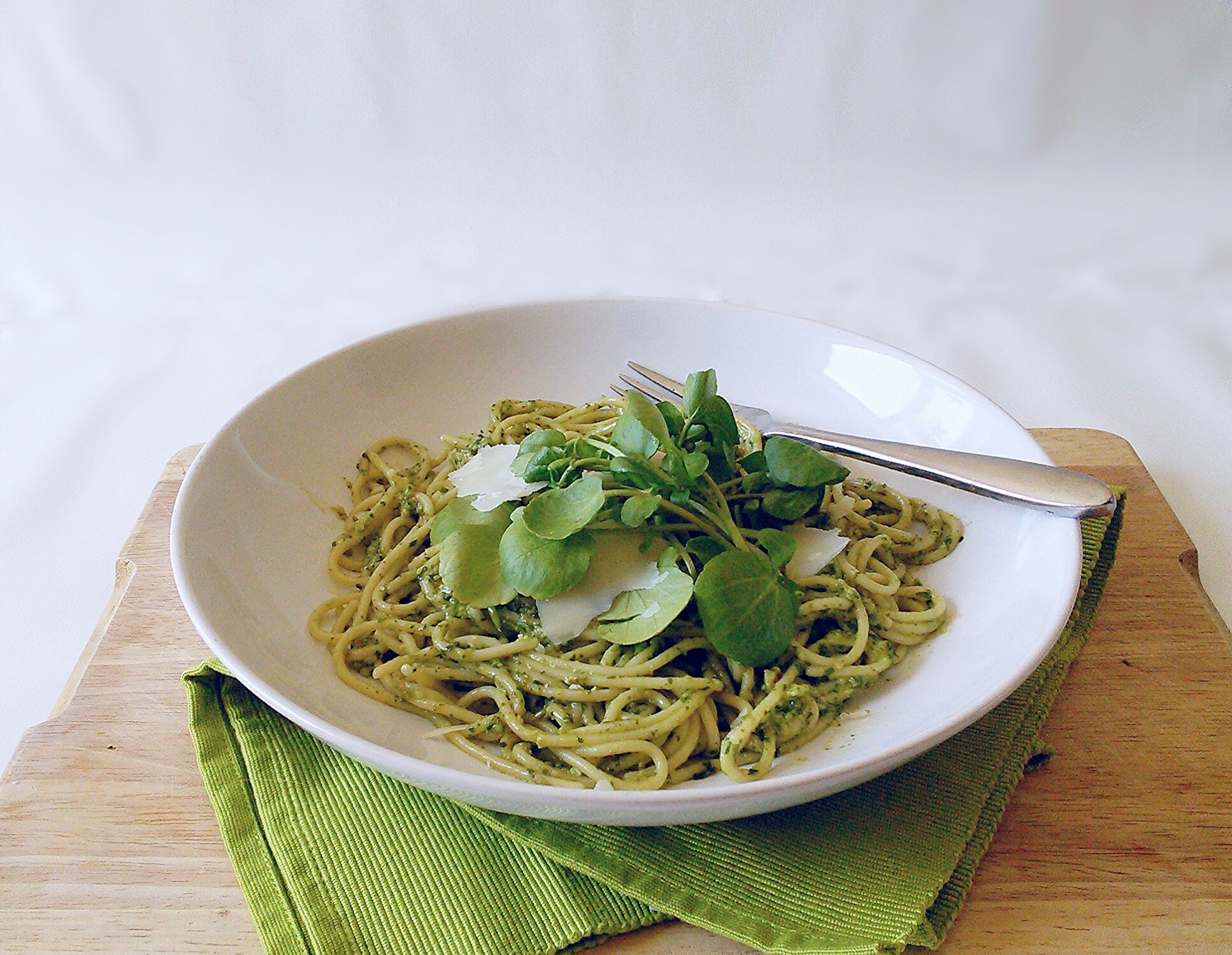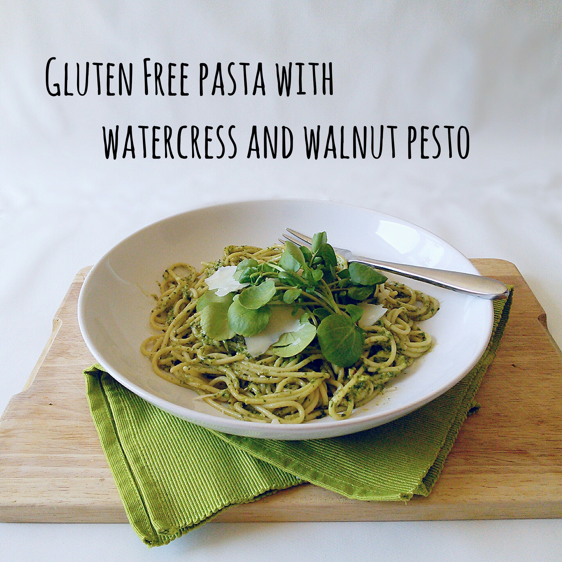 Today I fancied something quick, tasty and cheesy for lunch. I had a big healthy bag of watercress in the fridge and this is a really tasty way to use it. You can use any sort of gluten free pasta for this dish but I used Glutafin spaghetti. Serves: 4 Ingredients 30g watercress 30g basil 2 tbsp walnuts 1 garlic clove – sliced 30g parmesan – grated A few parmesan shavings 1 tsp sea salt 100ml olive oil 400g gluten free pasta Add the watercress, basil, walnuts, garlic, salt, parmesan and oil to a blender and blend. Setting aside a few sprigs of watercress for decoration.