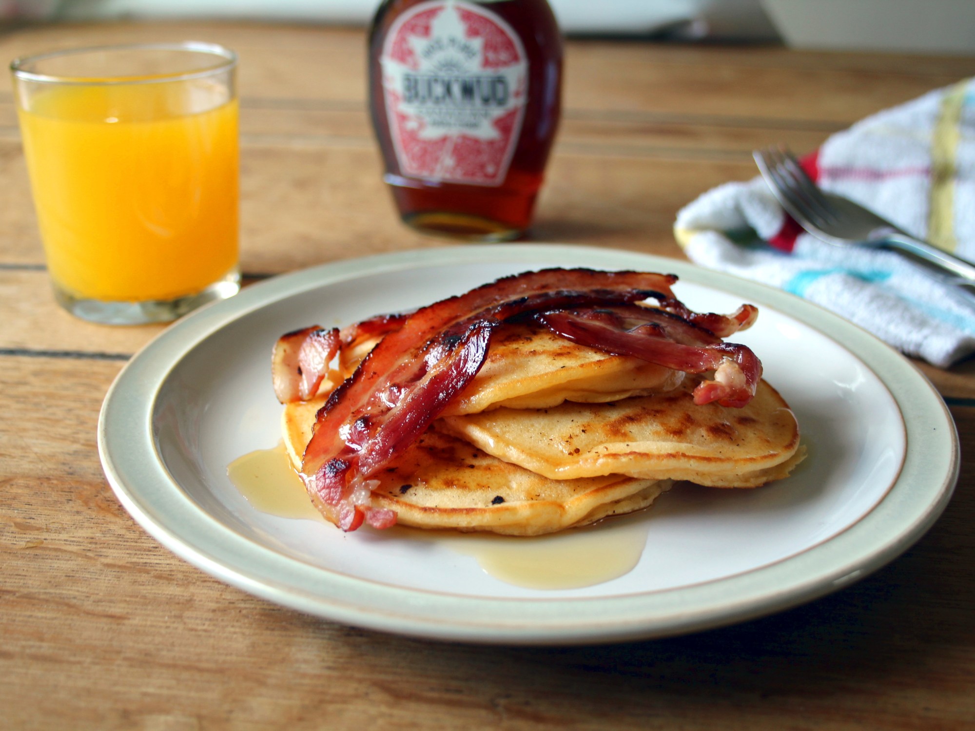 Split the pancakes between two plates and top each stack with two rashers of bacon.