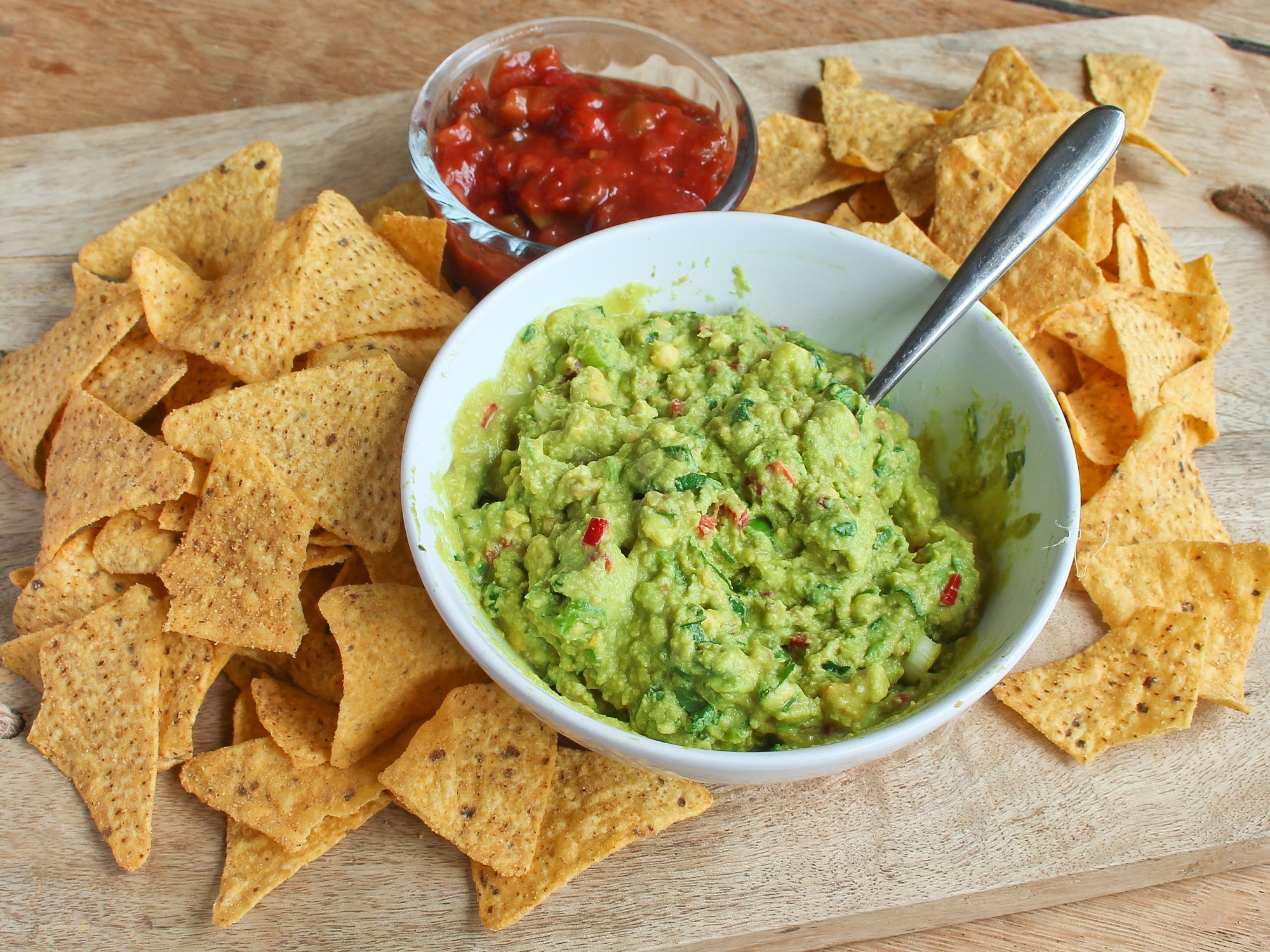 Get a nice ripe avocado and guacamole is super easy and quick to make. Once you’ve had a freshly made batch you’ll never want to go back to the fake tasting shop bought ones again. I’ve served it with crunchy corn chips and hot spicy salsa but it’s also delicious in fajitas and quesadillas or just spread on toast. If you’re trying to lose a bit of weight or just be a little healthier serve it with crunchy carrot and celery sticks for a totally carb free snack.