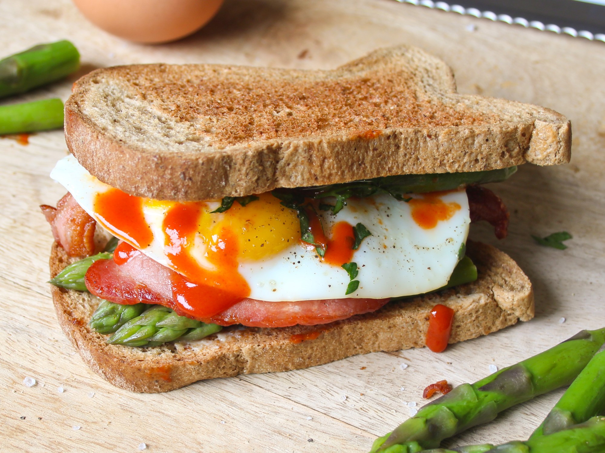 Top two slices with asparagus spears, split the bacon between the two sandwiches and top with the fried eggs. Sprinkle over a little chopped parsley and add a squirt or two of sriracha. Finally season with salt and pepper top with the other slices of toast and serve immediately alongside a nice cup of tea.