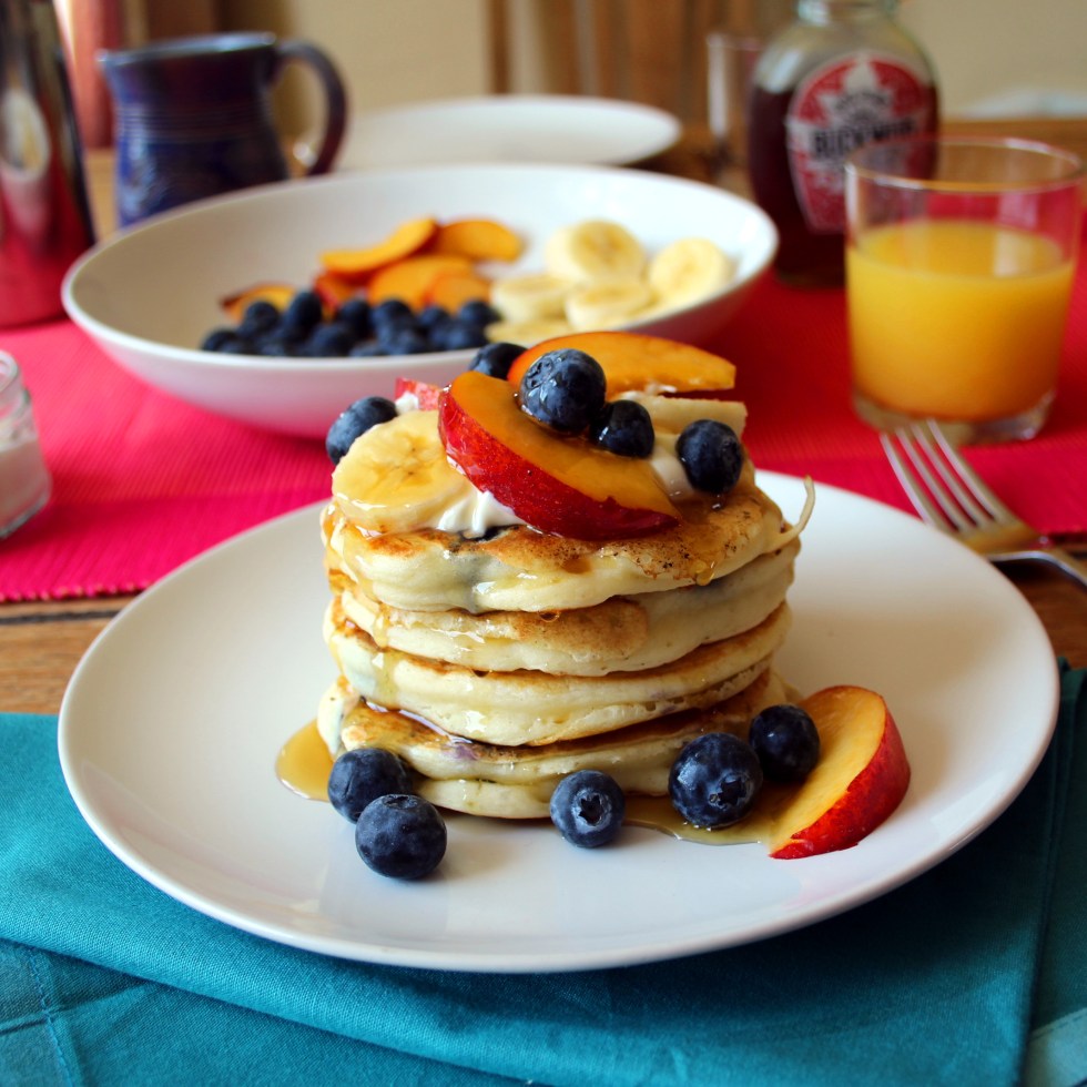Blueberry Pancakes with Fruit, Crème Fraiche and Maple Syrup