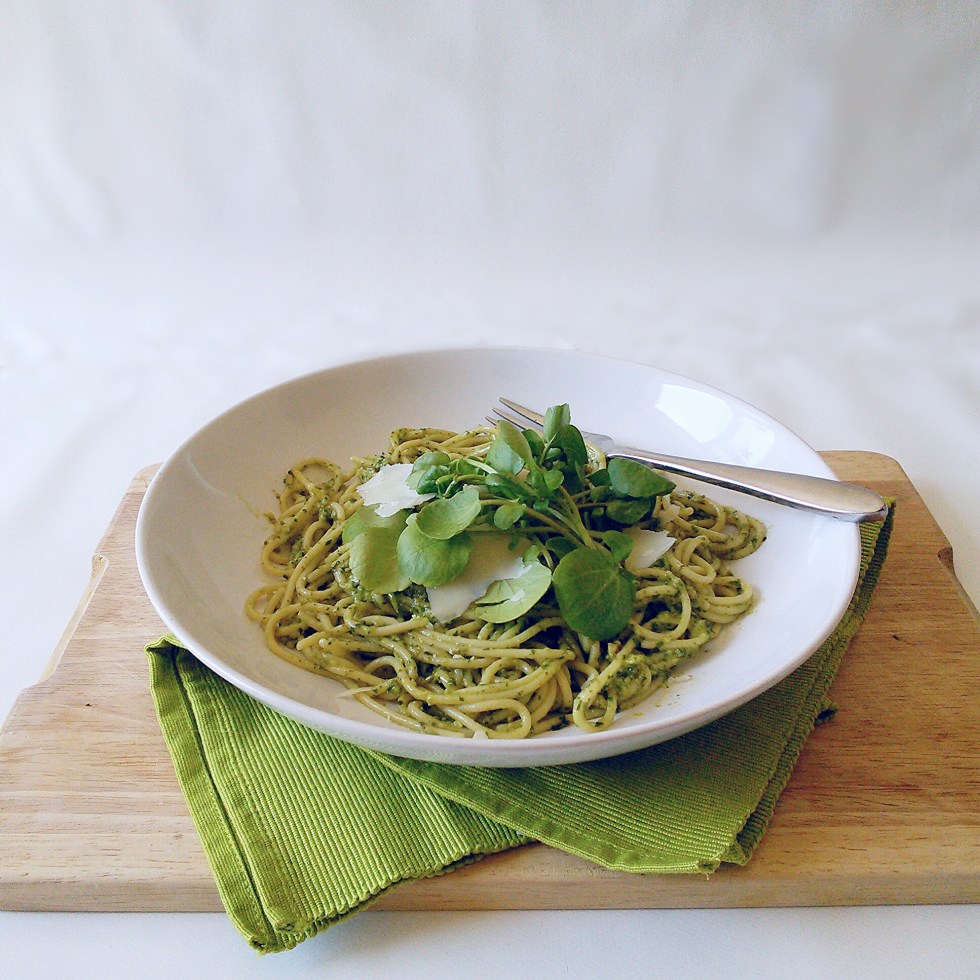 Gluten Free Pasta with Watercress and Walnut Pesto